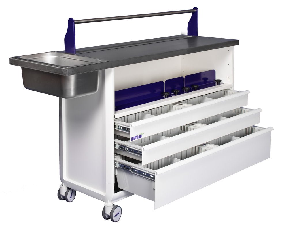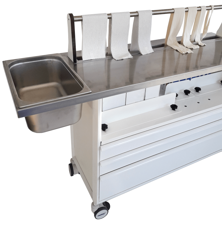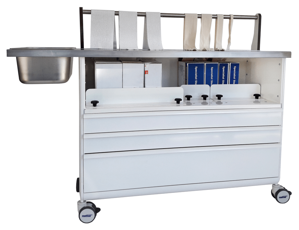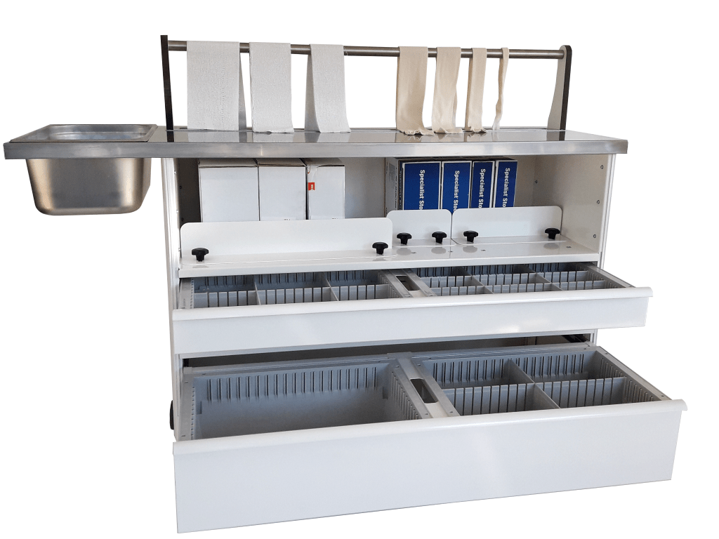 Integrated cutting station: The opening in the worktop and access to stockinette / bandage rolls means technicians can measure, cut, and drape directly at the trolley without shifting to another table.