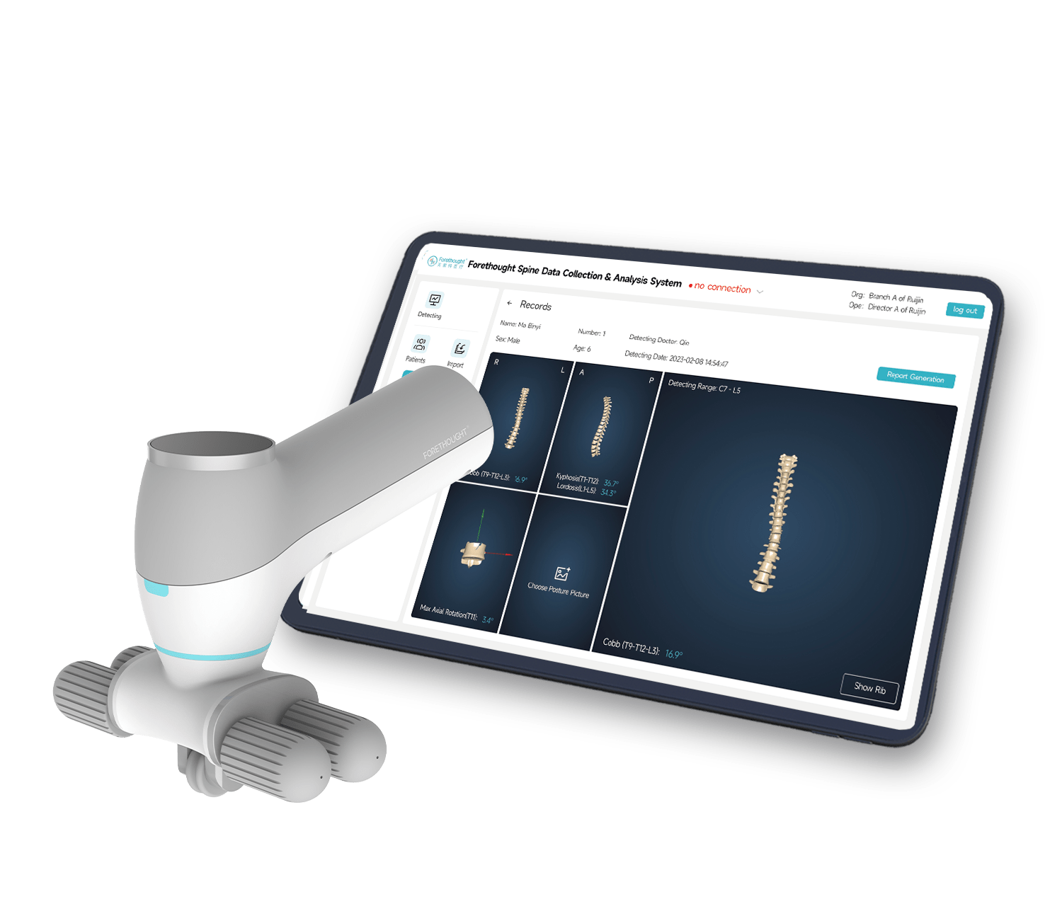 The ScoliMatrix 3D Detection System (FT08W) from Forethought Medical is a portable, next-generation scoliosis detection and spinal assessment solution designed to bring high-precision, 3D diagnostic capability into clinics, rehabilitation centers, hospitals, and physical examination settings — without the need for ionizing radiation.