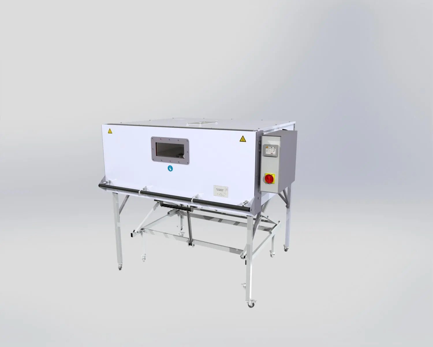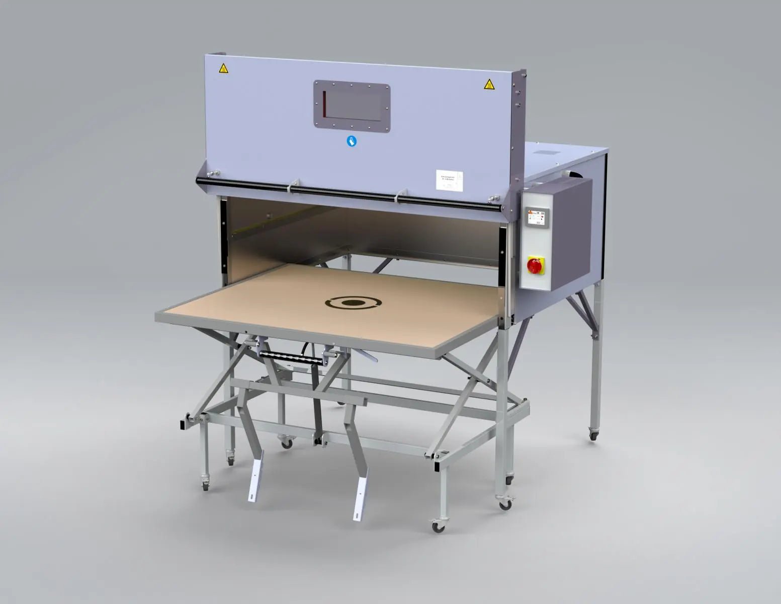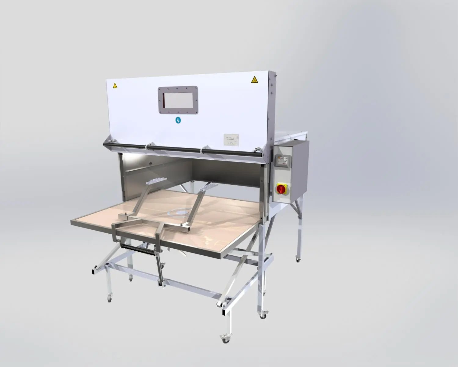 Height-adjustable mobile material cart: Comes with a movable cart on lockable casters with a gas-spring–assisted, infinitely adjustable height (working height 820–1050 mm). The cart includes a foldable holder for thermoforming / blister-forming frames — streamlining loading/unloading and improving ergonomics.