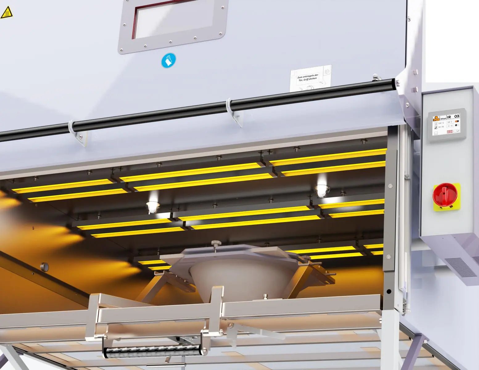 Modern controller with intuitive touch display: A 3.5" touch-panel controller shows both the set and actual temperatures. Features include programmable timer, ramp-up heating, graphical heating-process display, multilingual UI, automatic maintenance notifications — and future-proofing via software updates over USB.