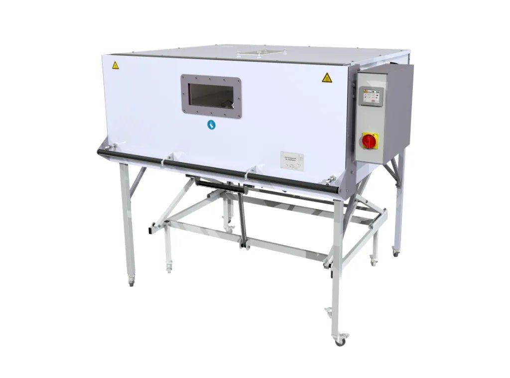 Large internal capacity for bigger workpieces: Internal dimensions are 1300 × 1090 × 500 mm, providing ample space for large thermoplastic sheets, shell blanks, orthotic shells, or thermoforming frames. External dimensions are 1595 × 1270 × 1400 mm (height with door open: 1850 mm).