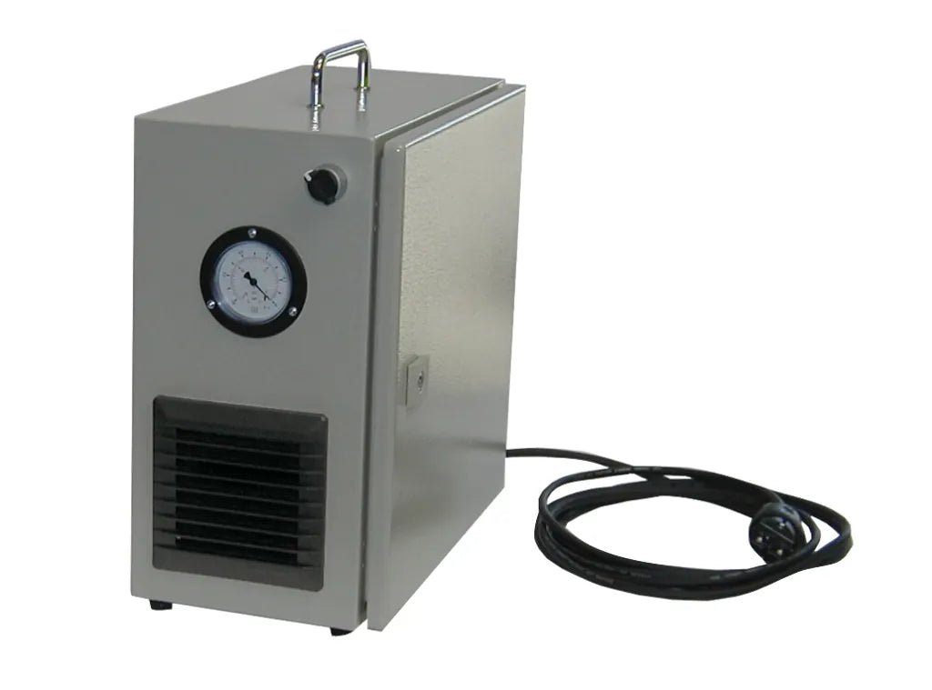 Fully automated vacuum control: The built-in electronics continuously monitor vacuum levels. The pump automatically activates when vacuum is requested (e.g. when a connected press closes) and shuts off when target vacuum is reached — reducing energy use, noise, and wear.
